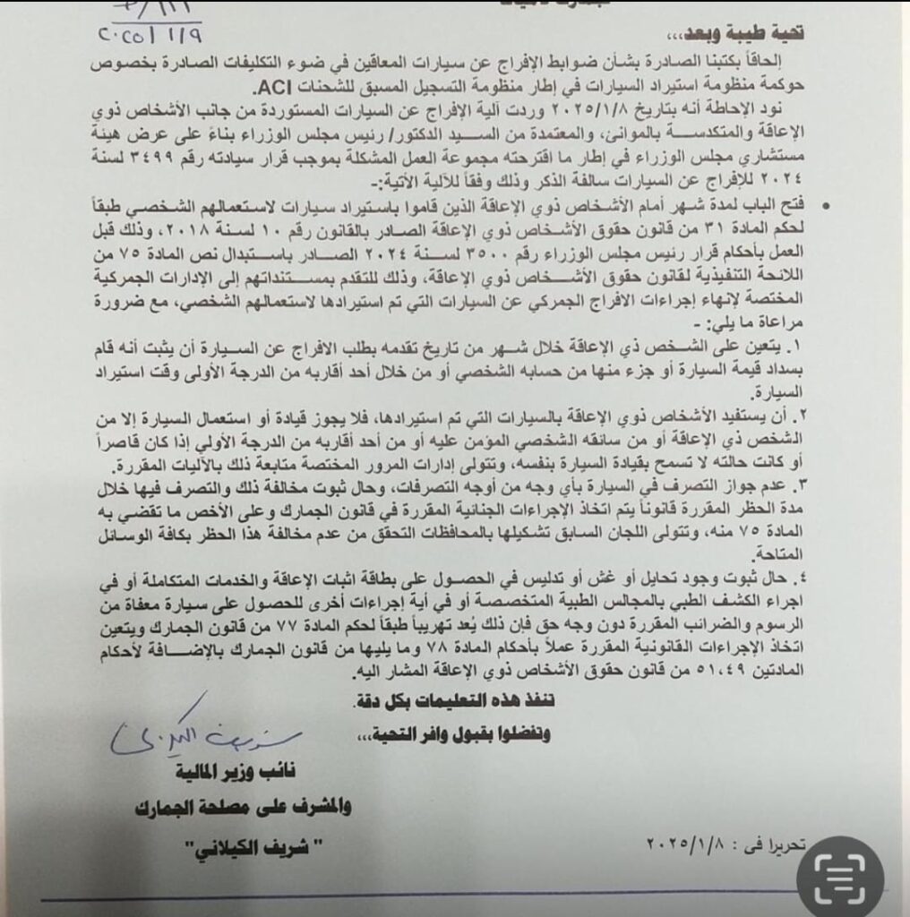 وفقًا لهذه التعليمات، سيتم فتح الباب لمدة شهر أمام الأشخاص ذوي الإعاقة الذين استوردوا سيارات ذوي الاحتياجات الخاصة لاستعمالهم الشخصي قبل العمل بأحكام قرار رئيس مجلس الوزراء رقم 3500 لسنة 2024. يشترط على المستفيدين تقديم كافة المستندات المطلوبة إلى الإدارات الجمركية المختصة لإنهاء إجراءات الإفراج الجمركي عن سياراتهم.