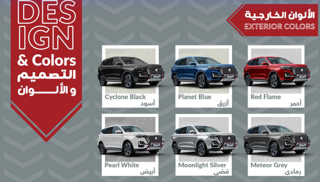 تشمل خيارات الألوان: الأبيض الكلاسيكي، الأبيض اللؤلؤي الفاخر، الفضي اللامع الذي يعكس الطابع الحديث، الفيراني الأنيق، البترولي الجذاب، النبيتي المميز الذي يبرز الشخصية القوية، والأسود الفخم الذي يضفي مظهرًا رياضيًا وراقٍ في الوقت ذاته.