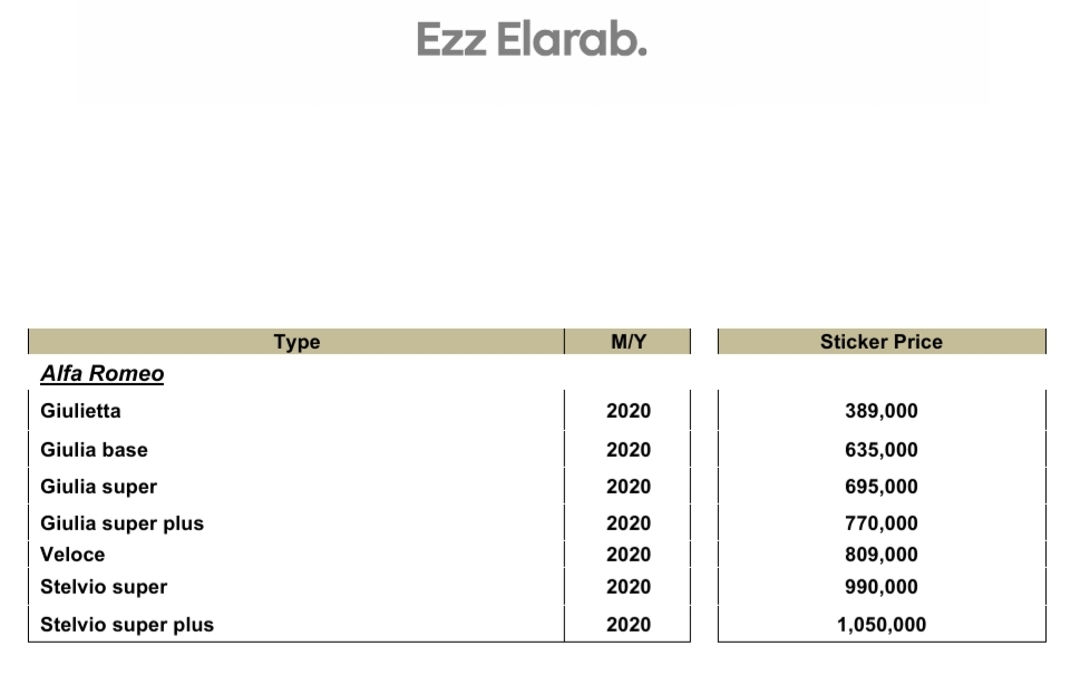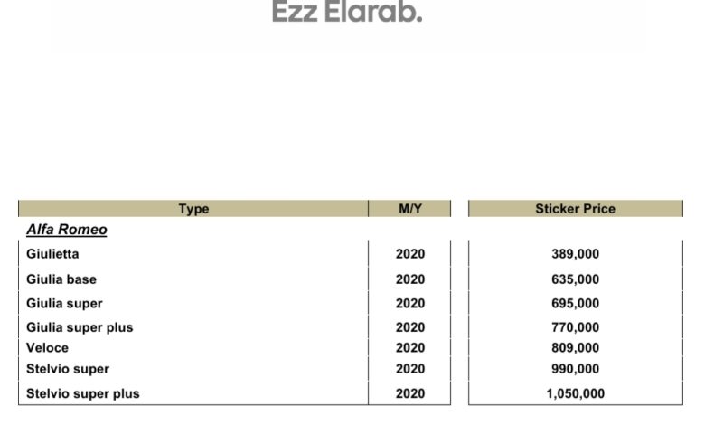 أعلنت مجموعة عز العرب للسيارات، أحد موزعي العلامة التجارية ألفا روميو في مصر عن قائمة أسعار سياراتها لشهر أغسطس ٢٠٢٠.