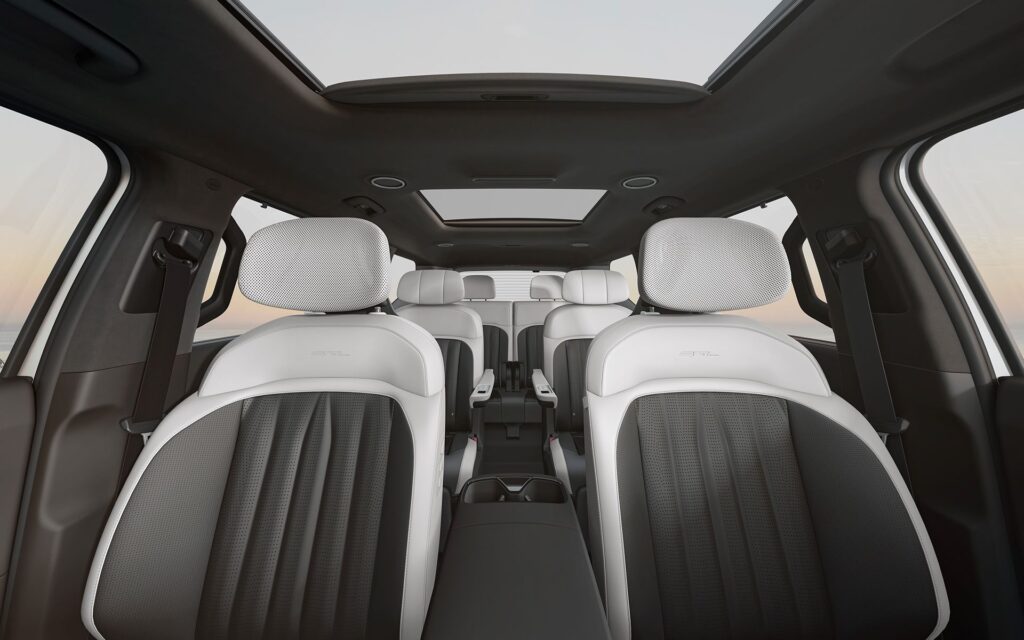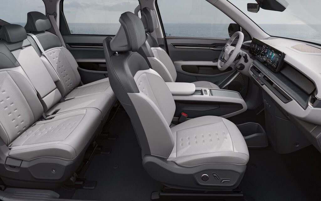المقصورة مصممة لتوفير راحة مطلقة لجميع الركاب، مع لمسات فخامة واضحة تعكس مكانة EV9 كأكبر SUV كهربائية في التشكيلة.