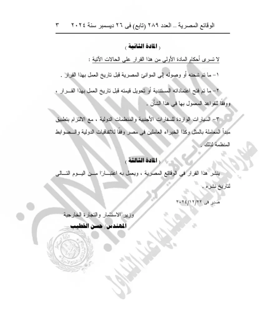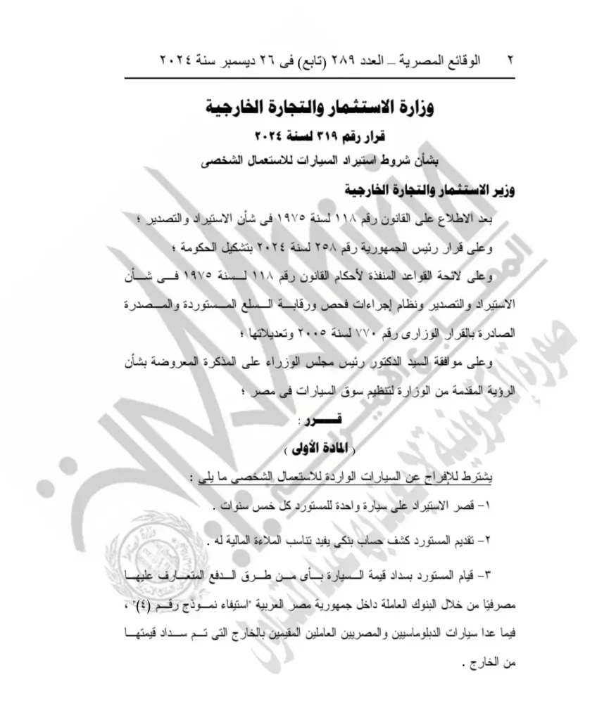 وفي أواخر ديسمبر 2024 نشرت الجريدة الرسمية في العدد 289 (تابع) قرار رقم 319 لسنة 2024، والذي أصدرته وزارة الاستثمار والتجارة الخارجية. يتناول القرار شروط استيراد السيارات للاستعمال الشخصي، ويأتي في إطار جهود الحكومة لتنظيم هذا القطاع.