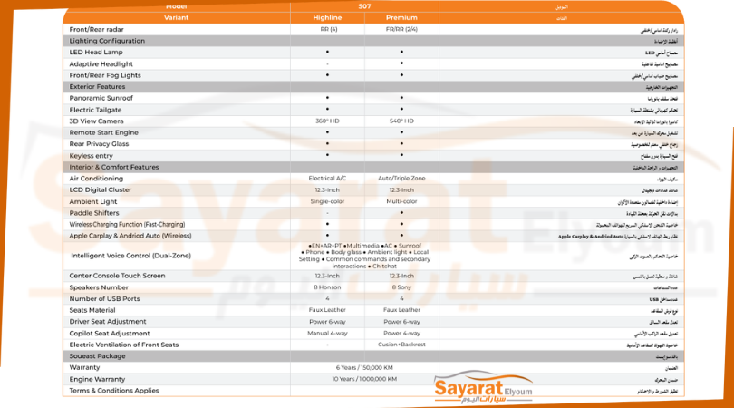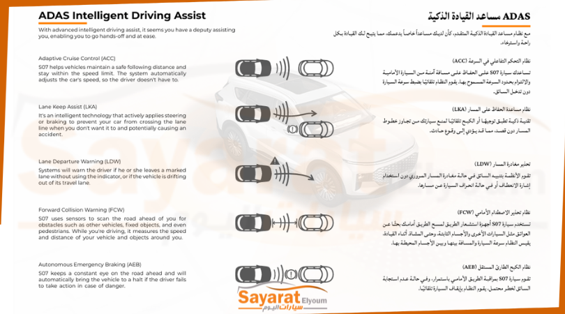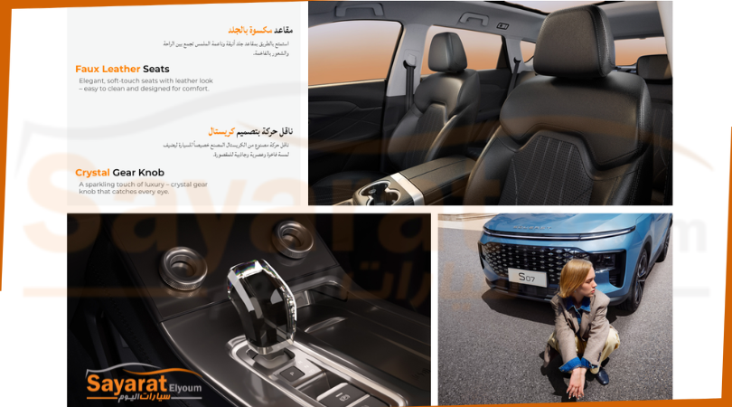الاهتمام بالتفاصيل يظهر في جودة الخامات الداخلية، ومساحات الجلوس الواسعة في الصفين، فضلًا عن سعة تخزين مرنة تناسب الاستخدام اليومي والعائلي. كل هذا يجعل من S07 اختيارًا مثاليًا للباحثين عن القيمة والرفاهية في آنٍ واحد.