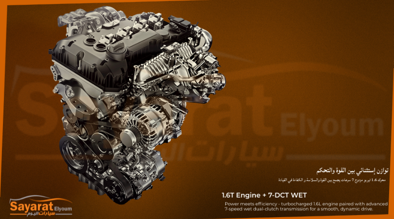 ويتصل المحرك بناقل حركة أوتوماتيكي ثنائي القابض DCT من 7 سرعات، مما يوفّر استجابة سريعة وسلاسة ملحوظة في التنقّل بين السرعات.