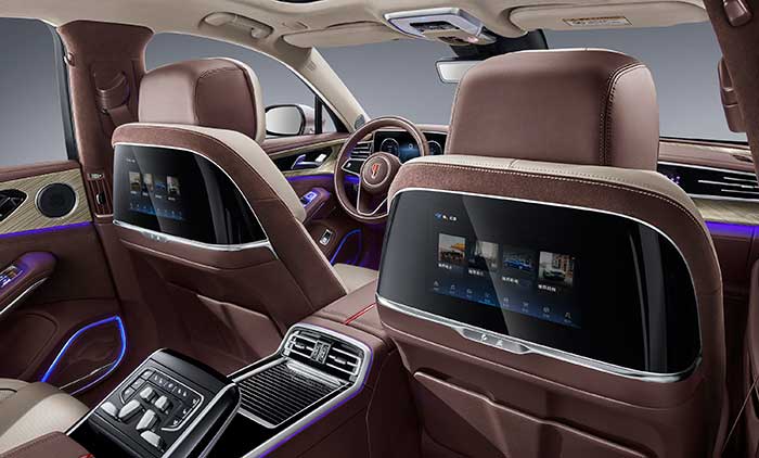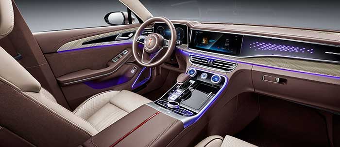 داخل هونشي H9 يكشف عن عالم من الفخامة المترفة، حيث تأتي المقصورة بمواد عالية الجودة من الجلد الطبيعي والخشب والألومنيوم، مع تصميم أنيق للكونسول الوسطي وشاشات رقمية متكاملة.