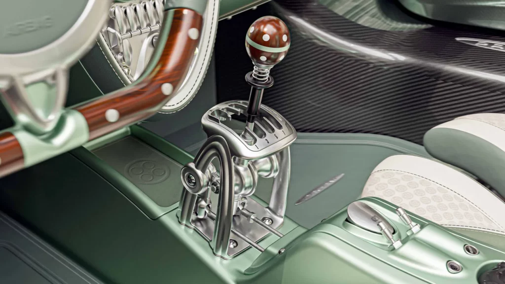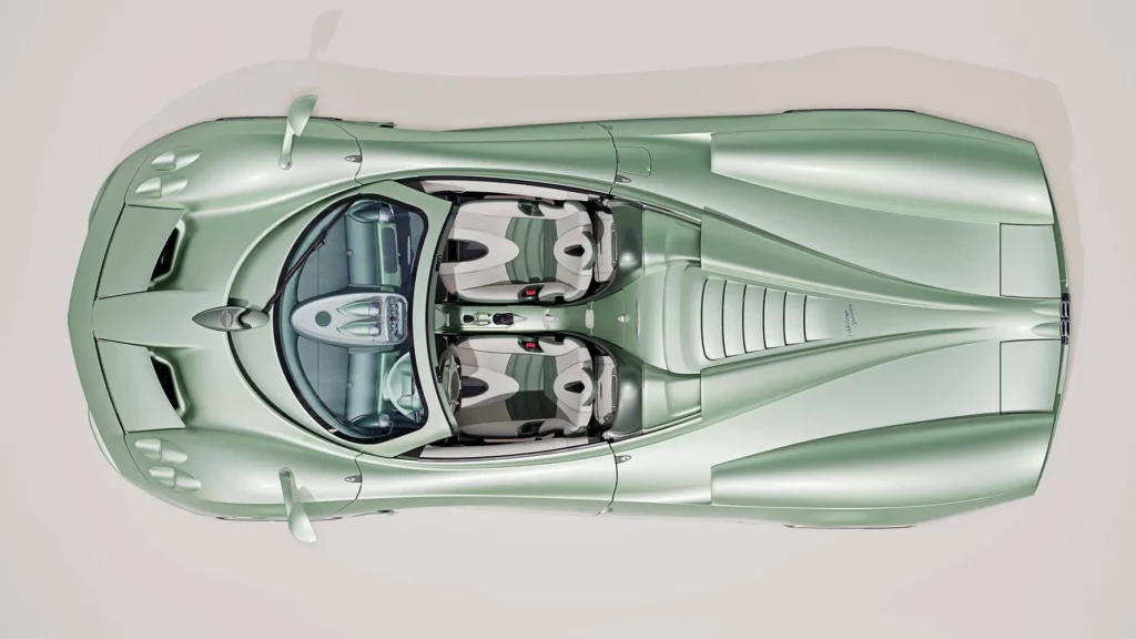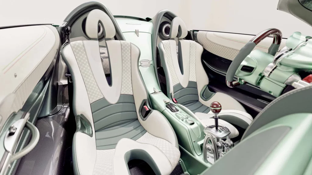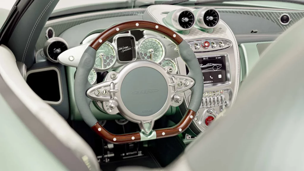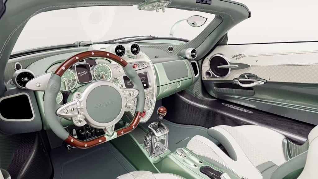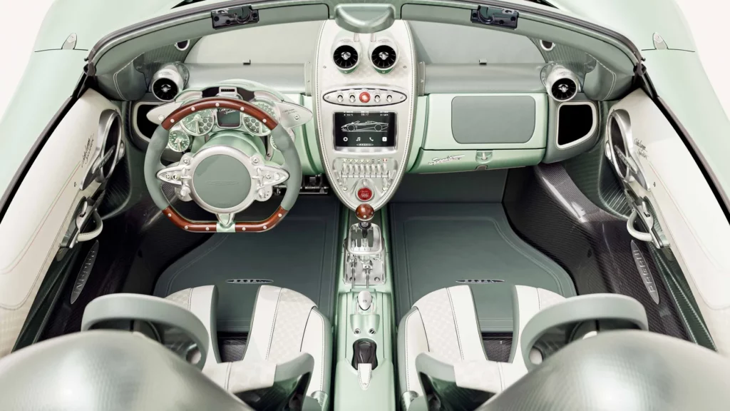 تكتمل فخامة المقصورة بمجموعة من التفاصيل الدقيقة مثل المقابض والأزرار المصنوعة من الألومنيوم المشغول من كتلة واحدة، والتي تحمل شعار باجاني المنقوش بدقة متناهية. كل عنصر في المقصورة، مهما كان صغيراً، خضع لعملية تصميم وتصنيع دقيقة بأيدي حرفيين متخصصين، ليعكس فلسفة هوراسيو باجاني القائمة على الجمع بين العلم والفن في توازن مثالي.