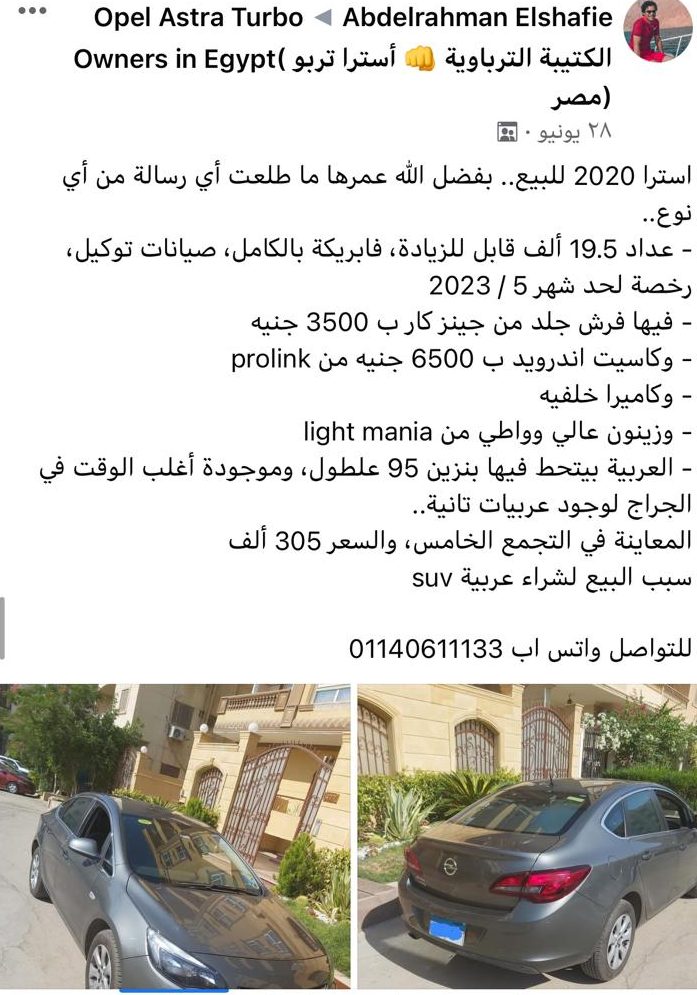 أحد الملاك يعرض سيارته في يونيو بمليغ 305 آلاف جنيه وهي موديل 2020