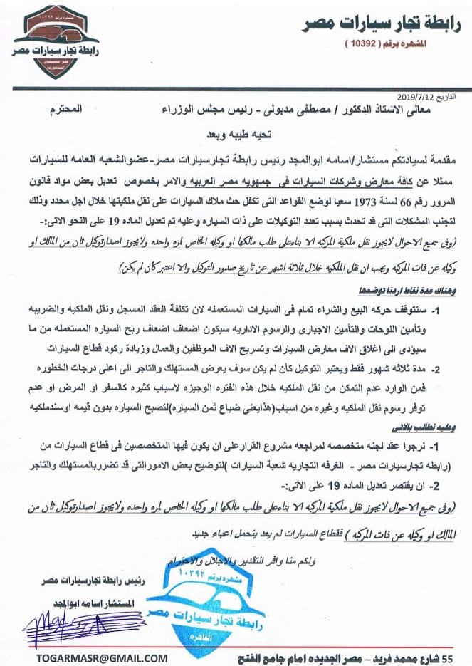 قدم المستشار أسامة أبو المجد رئيس رابطة تجار سيارات مصر، وعضو الشعبة العامة للسيارات، ممثلا عن كافة معارض وشركات السيارات فى مصر، مذكرة لرئيس مجلس الوزراء، الدكتور مصطفى مدبولي، تتضمن اعتراض الرابطة على تحديد مدة صلاحية توكيل نقل الملكية بثلاث شهور فقط.