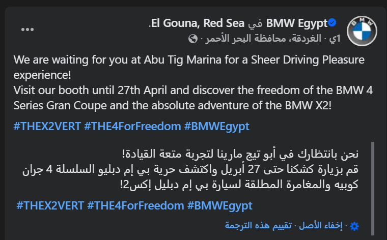 “نحن في انتظارك في أبو تيج مارينا لتجربة قيادة لا تُنسى! زوروا جناحنا حتى 27 أبريل واكتشفوا حرية الأداء مع BMW 4 Series Gran Coupé والمغامرة المطلقة مع BMW X2!”.
