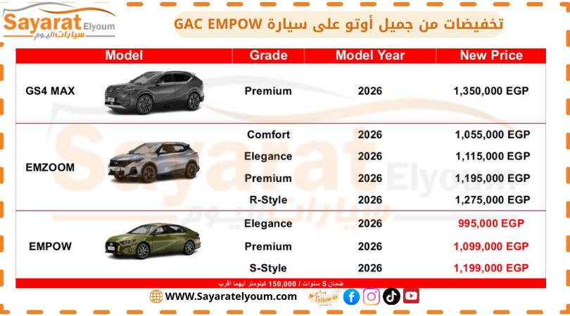 أعلنت جميل موتورز عن الأسعار الجديدة لثلاث فئات من GAC Empow موديل 2026، وجاءت كالتالي: