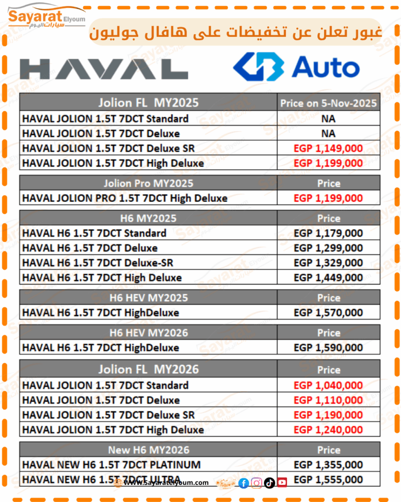 في خطوة استراتيجية تهدف إلى تعزيز تنافسيتها في سوق السيارات المصري، أعلنت مجموعة «جي بي أوتو» — الوكيل الحصري لعلامة «هافال» التابعة لشركة «جريت وول موتورز» الصينية — عن سلسلة من التخفيضات الكبيرة على أسعار سيارات هافال جوليون وهافال جوليون برو موديل 2025، بالتزامن مع طرح الجيل الأحدث من السيارة موديل 2026 رسميًا في السوق المحلي.