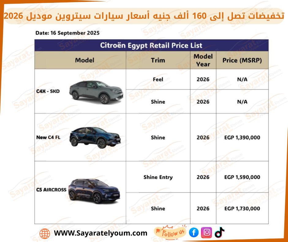 - سيتروين C4 المستوردة بالكامل: تخفيض قدره 160 ألف جنيه.