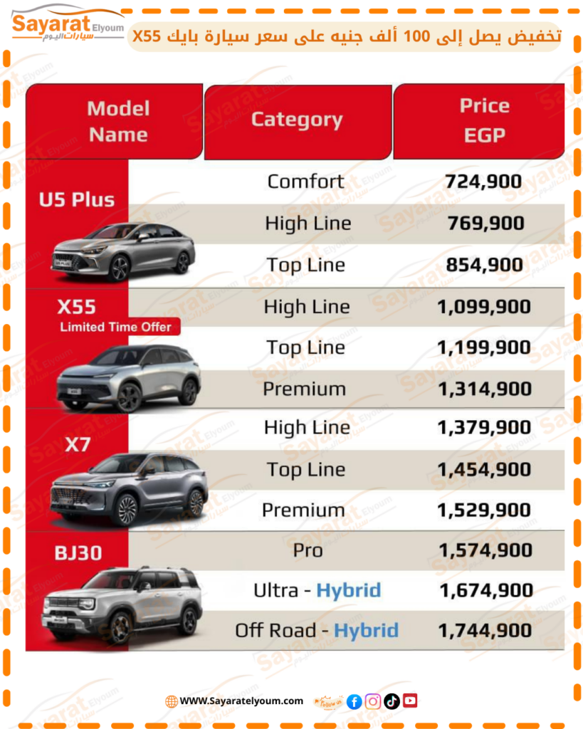 وفقًا للعرض الرسمي، جاءت الأسعار الجديدة لفئات بايك X55 كما يلي: