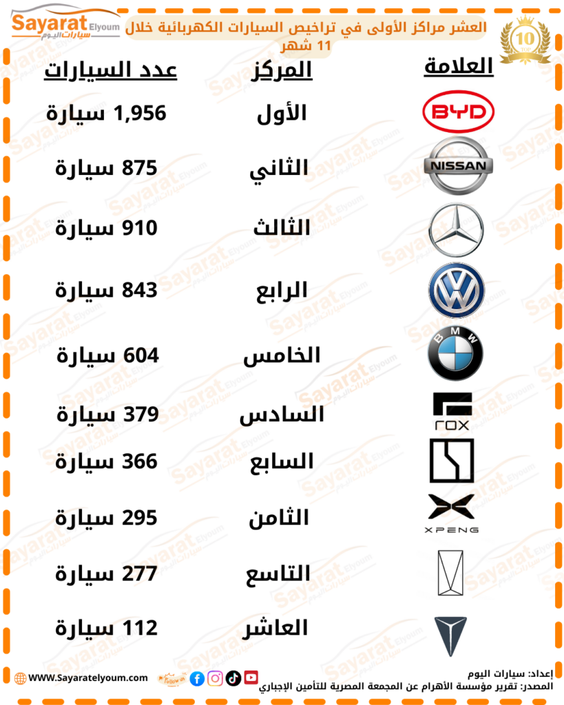 - BYD تصدرت المشهد طوال العام، تليها نيسان ومرسيدس وفولكس فاجن.