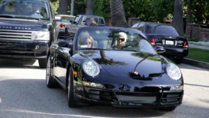 ديفيد بيكهام ، الذي تبعه حراسه الشخصيين ، وزوجته فيكتوريا في سيارة بورش 911 كابريوليه.