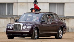 هل المشاهير أكثر شهرة من صاحبة الجلالة الملكة؟ هذه هي واحدة من سيارتيها التابعتين لسيارات بنتلي ستيت ، التي أنشأتها الشركة المصنعة كرو قبيل يوبيل جولدن 2002.