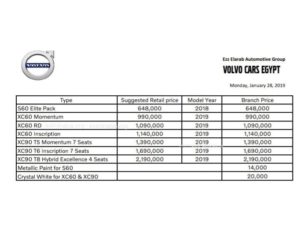 أعلنت شركة عز العرب وكيل ماركة فولفو العالمية، عن قائمة أسعار سيارات فولفو لشهر فبراير 2019 ، حيث شملت القائمة عدد كبير من موديلات منها: s60 Elite ، xc60 momentun , xc60 RD , XC90 , metallic