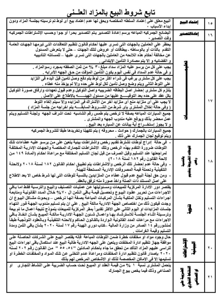 - اقرأ كراسة الشروط بعناية: تأكد من فهم جميع البنود المتعلقة بالمزاد، خاصة شروط الدفع والاستلام.