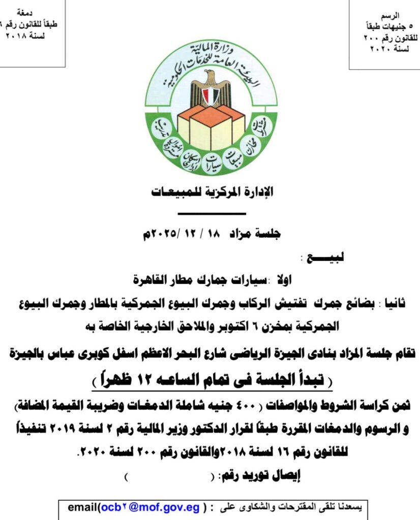 أعلنت الهيئة العامة للخدمات الحكومية عن تنظيم مزاد سيارات جمرك مطار القاهرة، والمقرر إقامته يوم الخميس 18 ديسمبر 2025. يأتي هذا المزاد في إطار جهود الهيئة لتدوير الأصول غير المستغلة وتعزيز الشفافية في بيع السيارات المستوردة أو المخزنة لدى الجمارك.