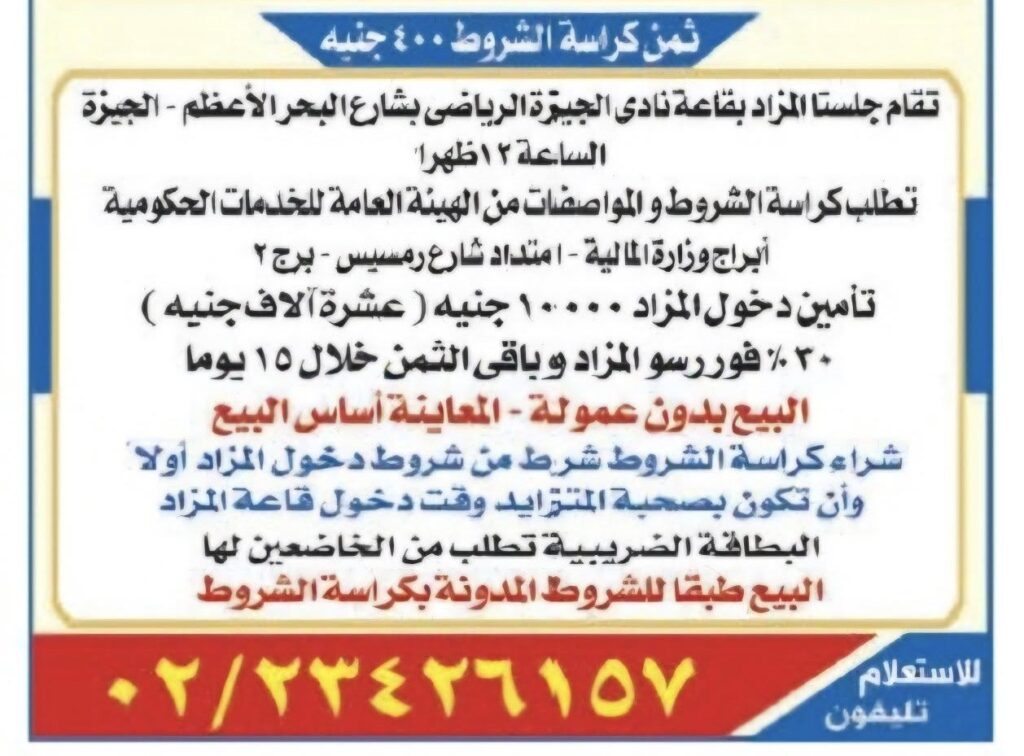 يُشترط شراء كراسة الشروط من مقر الهيئة الكائن في أبراج وزارة المالية، برج 2، امتداد شارع رمسيس بمدينة نصر، القاهرة، مقابل مبلغ 400 جنيه مصري. - تأمين دخول المزاد: