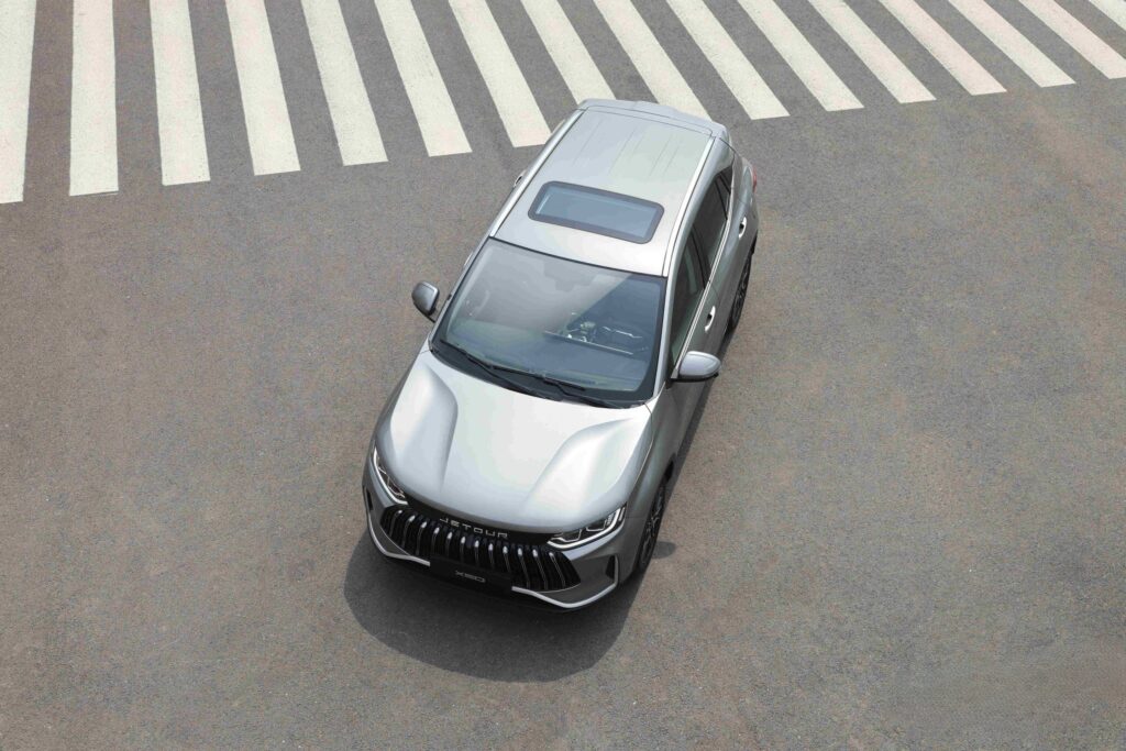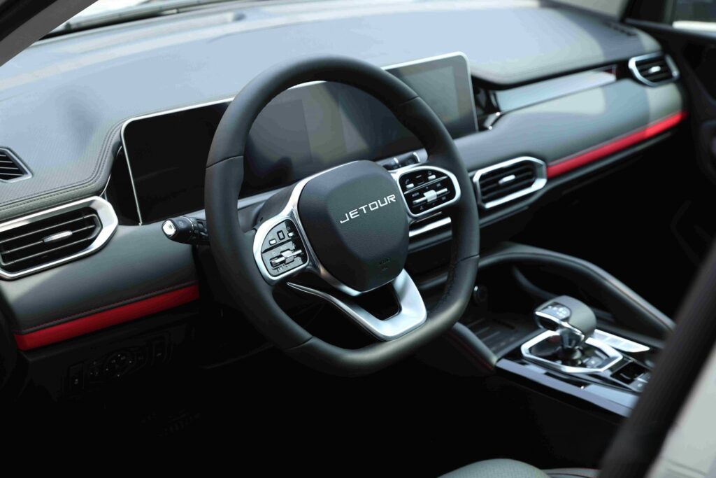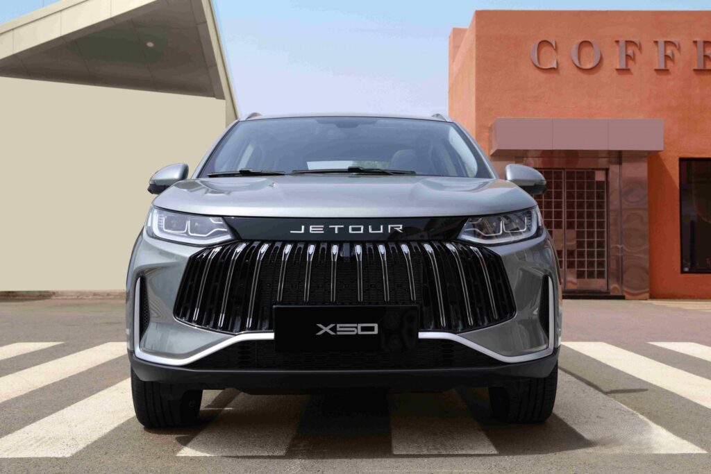 مصابيح LED أمامية وخلفية بتصميم حاد الزوايا، ما يضفي مظهرًا عصريًا لافتًا. كما تحمل مقدمة السيارة شعار JETOUR البارز لتعزيز هوية العلامة التجارية.