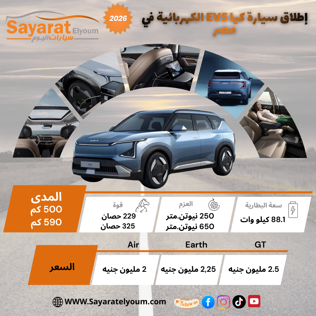 | 9 ديسمبر | Kia EV5 | كهرباء | 2,000,000 / 2,250,000 / 2,500,000 جنيه |