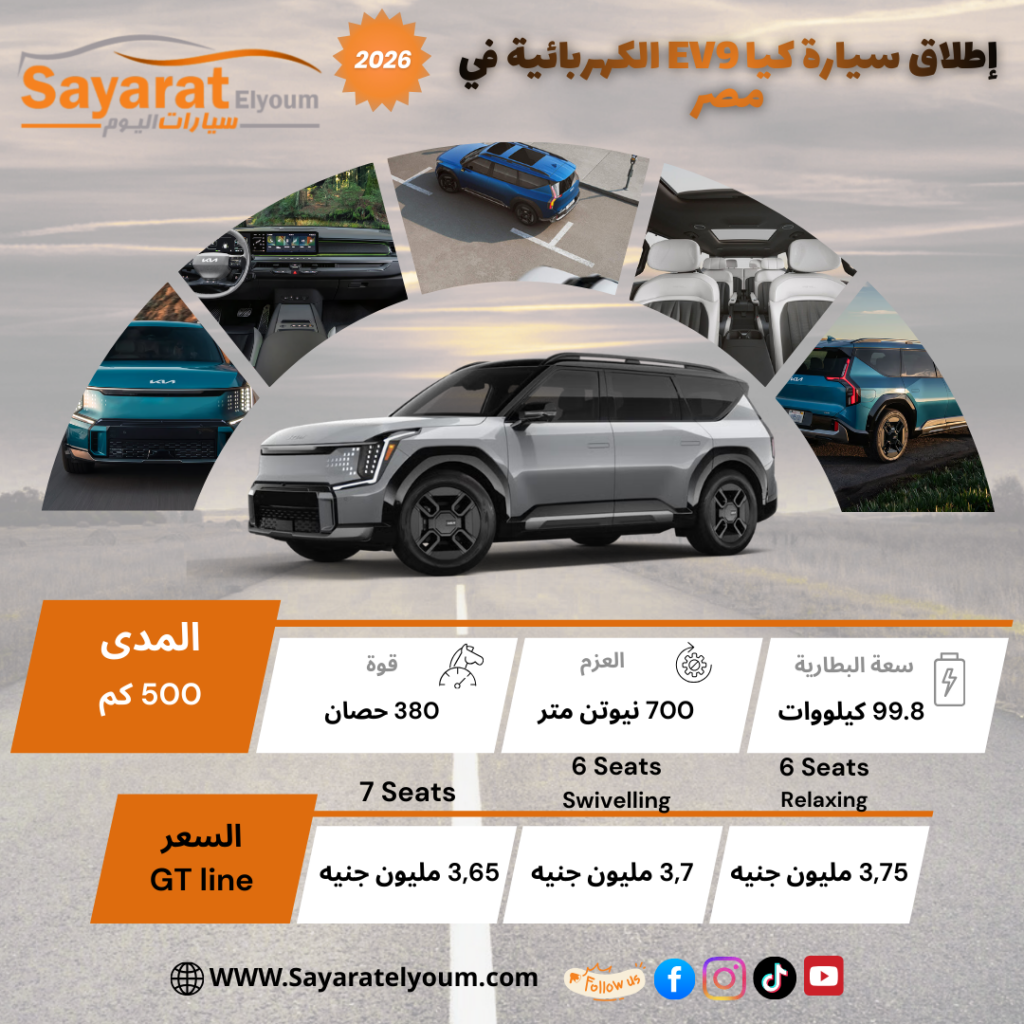 | 9 ديسمبر | Kia EV9 | كهرباء | 3,650,000 / 3,700,000 / 3,750,000 جنيه |