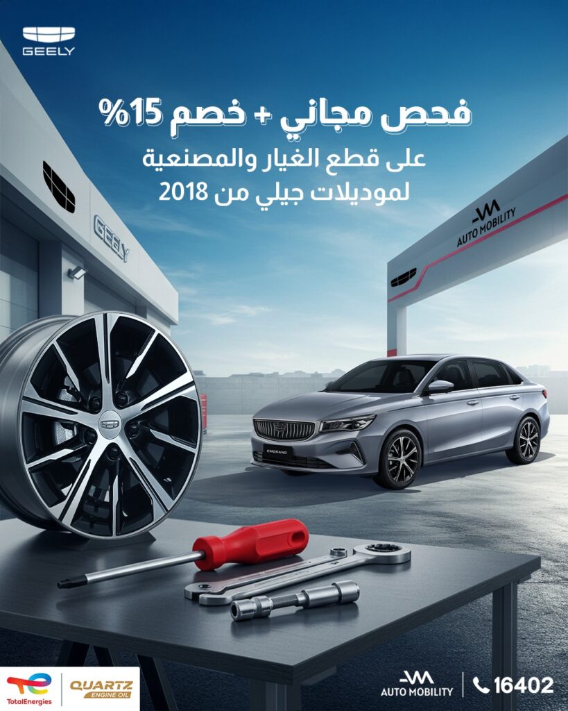 أعلنت شركة أوتو موبيليتي، الوكيل الرسمي لعلامة جيلي في مصر، عن إطلاق عرض جديد يشمل فحصًا شاملًا مجانيًا لمالكي سيارات جيلي موديل 2018 أو أحدث، بالإضافة إلى خصم 15% على قطع الغيار والمصنعية.