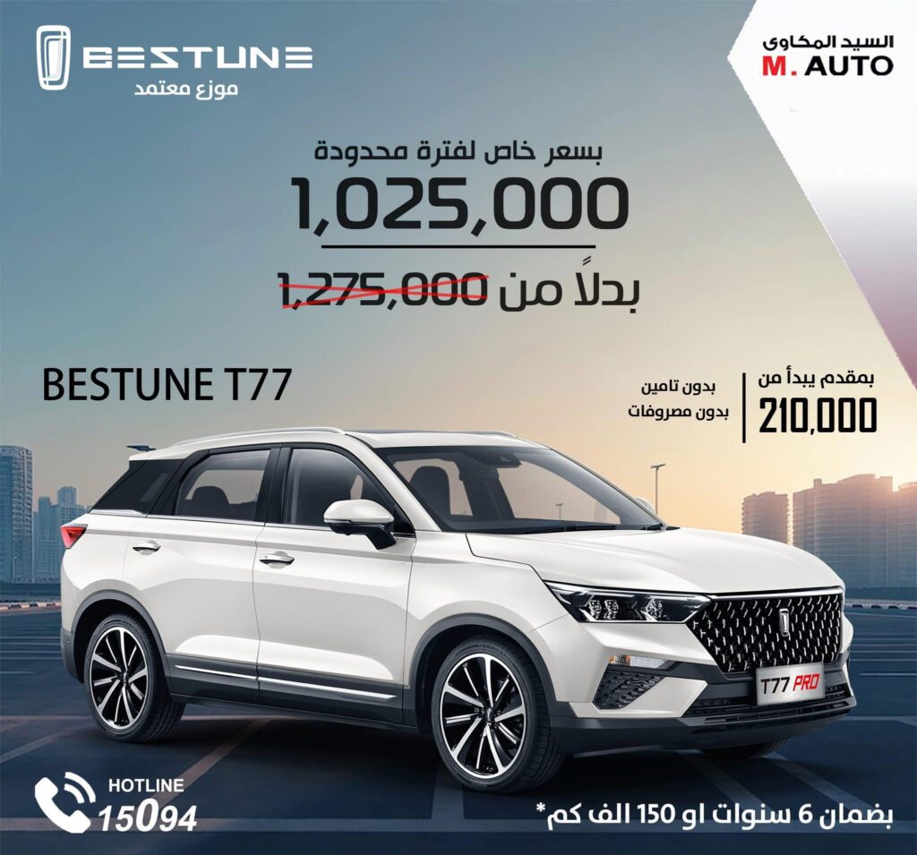 في خطوة مفاجئة من شأنها إعادة رسم خريطة المنافسة في سوق السيارات SUV، أعلن السيد المكاوي للسيارات (M.Auto) الموزع المعتمد لسارات بسيتون في مصر، عن خصم يصل إلى 250 ألف جنيه على السيارة بيستيون BESTUNE T77 PRO، مع عروض تمويل مميزة ومقدم يبدأ من 210 ألف جنيه فقط، وبدون أي مصروفات أو تأمين، إضافة إلى ضمان لمدة 6 سنوات أو 150 ألف كيلومتر.