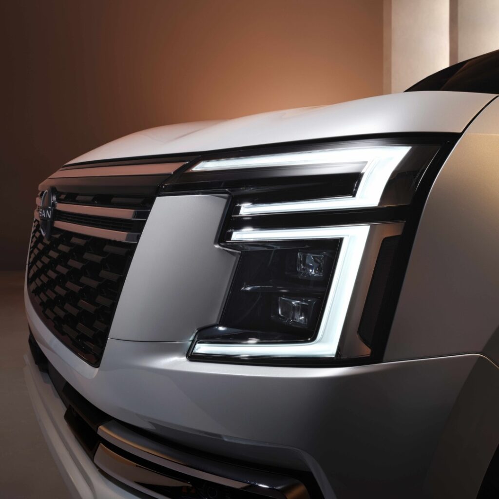 تتميز نيسان باترول الجديدة كليًا بتصميم خارجي يجمع بين الجرأة والأناقة. الشبك الأمامي الأيقوني على شكل حرف V مع تفاصيل كرومية يُعزز من حضور السيارة القوي. المصابيح الأمامية والخلفية بتقنية LED تُضفي توقيعًا ضوئيًا فريدًا، بينما تمنح العجلات المعدنية التي تصل إلى 22 بوصة مظهرًا جريئًا يعكس قوة السيارة.