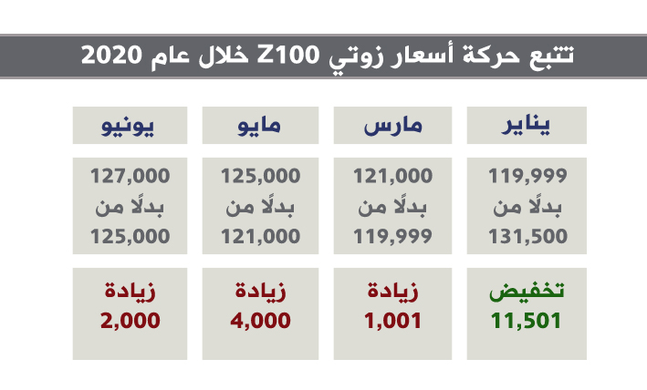 وبجانب ما ألم بزوتي “Z100” من ثلاثة زيادات خلال عام 2020, فقد شهدت بداية العام عرض تخفيض بقيمة 11,501 ج.م حيث أنخفض سعر السيارة من 131,500 إلى 119,999 ج.م. وهو ما قابلته زيادة بمجموع 7,000 ج.م خلال النصف الأول من عام 2020 حتى اليوم كما يوضح الشكل أعلاه.