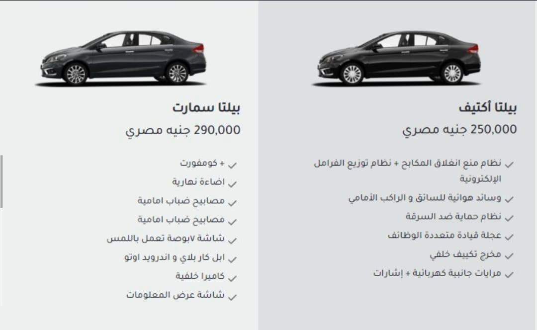 وتتوافر تويوتا بيلتا بفئتين من التجهيزات الأولي يبلغ سعرها 250 ألف جنيه والثانية بنحو 290 ألف جنيه.