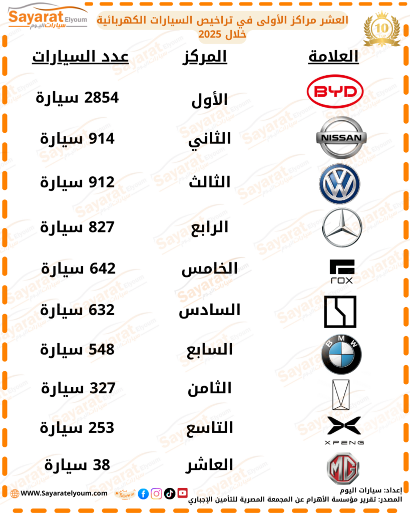 وفقًا للبيانات الصادرة عن المجمعة المصرية للتأمين الإجباري على المركبات بالتعاون مع مؤسسة الأهرام، فقد سجلت سيارات BYD الكهربائية أعلى عدد من التراخيص في مصر خلال 2025، بإجمالي بلغ: