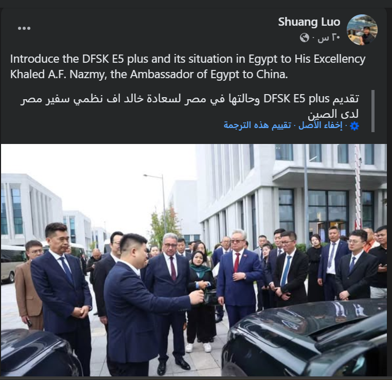 “Introduce the DFSK E5 plus and its situation in Egypt to His Excellency Khaled A.F. Nazmy, the Ambassador of Egypt to China.”