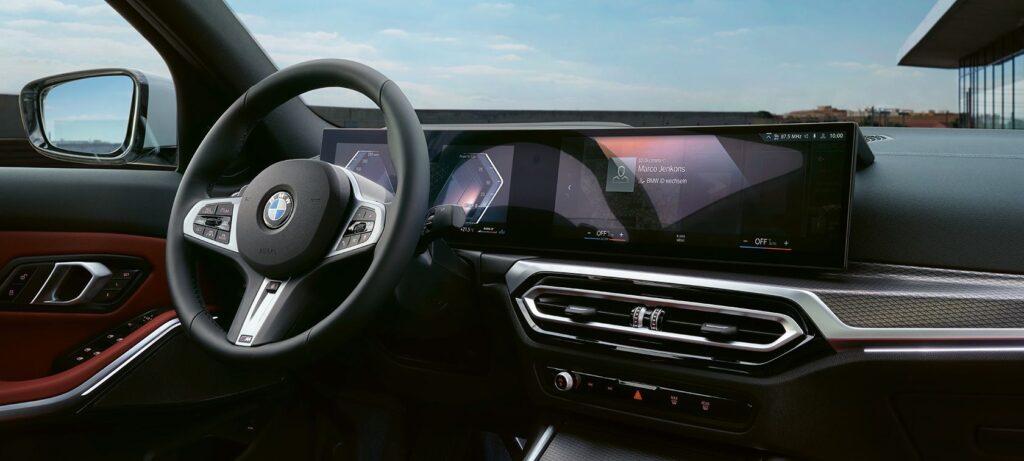 لم تقتصر BMW 3 Series الفئة الثالثة 320 على التصميم الرياضي أو الأداء المتوازن فقط، بل جاءت أيضًا مزودة بتقنيات ذكية تضعها في صدارة السيارات الفاخرة. النظام الترفيهي BMW Live Cockpit Plus يدمج شاشة وسطية 14.9 بوصة مع عدادات رقمية 12.3 بوصة، ويعمل بواجهة iDrive OS 8.5 التي تتيح تحكمًا سلسًا باللمس والصوت.