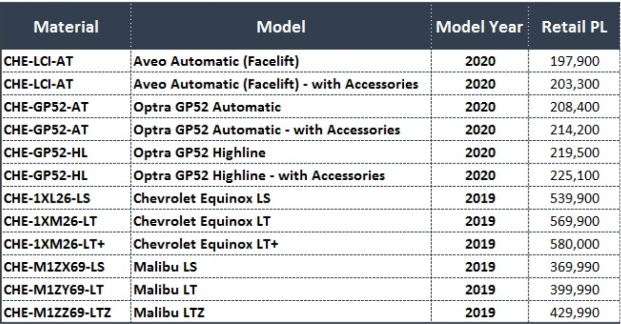 اعلنت شركة المنصور ، الوكيل الحصري لسيارات شيفرولية في مصر، قائمة أسعار شهر يناير 2020، حيث شملت القائمة عدد من الموديلات الحديثة منها، أفيو وأوبترا ومالينو .