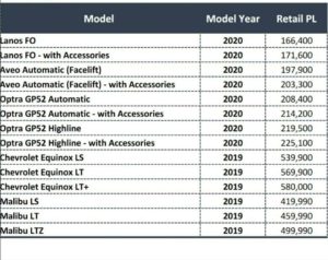اعلنت شركة المنصور ، الوكيل الحصري لسيارات شيفرولية في مصر، القائمة السعرية الجديدة لموديلات ٢٠٢٠ ، حيث شملت القائمة عدد من الموديلات الحديثة منها، أفيو وأوبترا ومالينو ولانوس