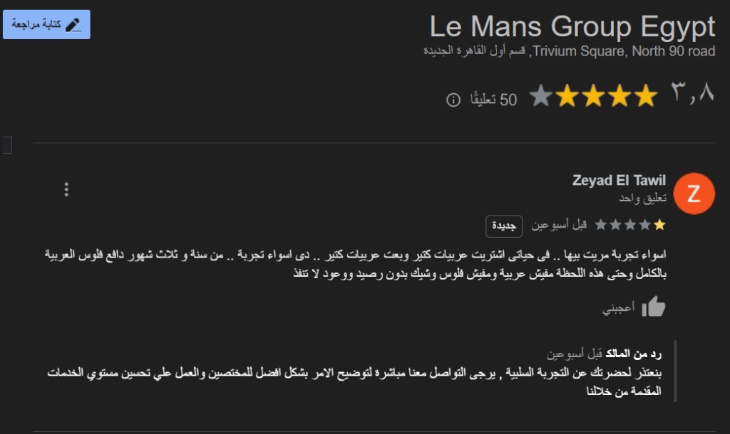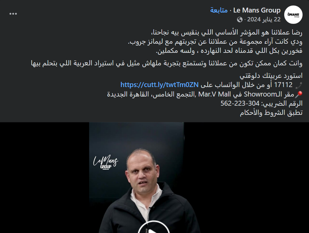 وهو ما يتنافى بشكل كامل عن كل ما تعلن عنه الشركة على صفحتها على فيس بوك من حيث السرعة في تسليم السيارات، وأن رضاء العميل هو الغاية الاولى لشركة ليمانز جروب ، هذا بخلاف الحملات الإعلانة للشركة على بعض مواقع السيارات .