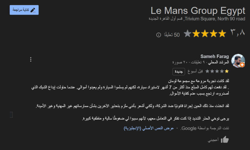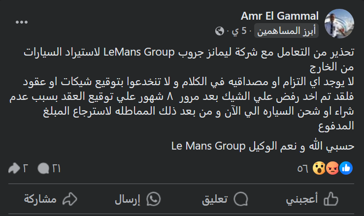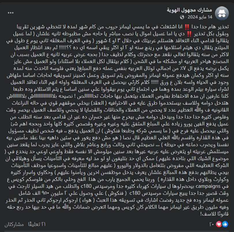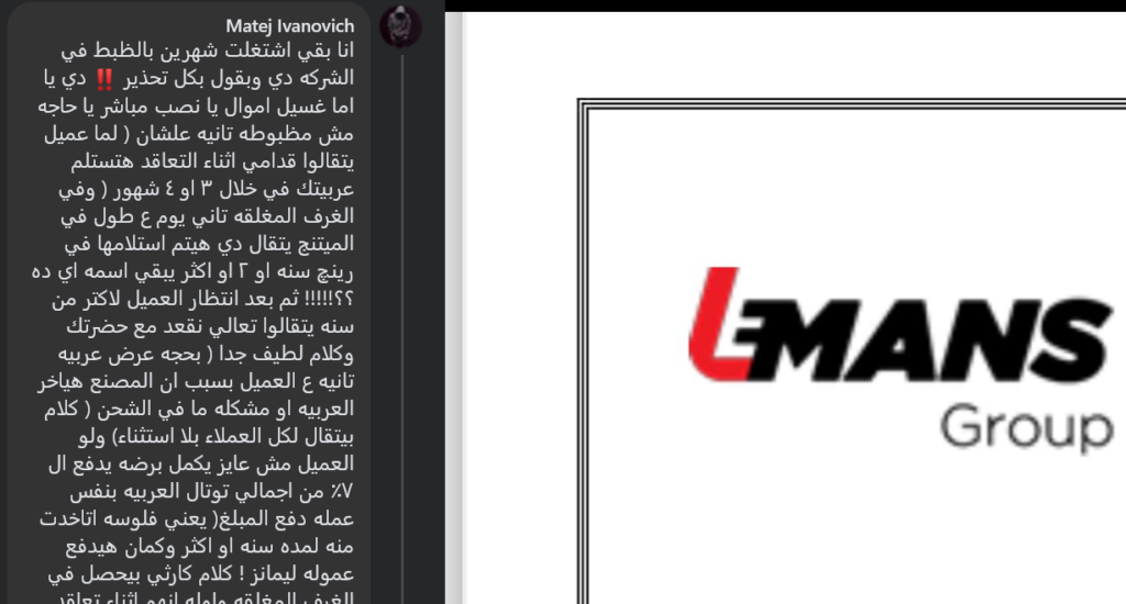 وكذلك توجد منشورات من أحد الأشخاص يؤكد أنه كان موظف لدى شركة ليمانز جروب، ذكر صاحب حساب باسم “Matej Ivanovich”، ” انا بقي اشتغلت شهرين بالظبط في الشركه دي وبقول بكل تحذير ‼️ دي يا اما غسيل اموال يا نصب مباشر يا حاجه مش مظبوطه تانيه علشان (لما عميل يتقالوا قدامي اثناء التعاقد هتستلم عربيتك في خلال ٣ او ٤ شهور (وفي الغرف المغلقه تاني يوم ع طول في الميتنج يتقال دي هيتم استلامها في رينچ سنه او ٢ او اكثر يبقي اسمه اي ده ؟؟!!!!! ثم بعد انتظار العميل لاكتر من سنه يتقالوا تعالي نقعد مع حضرتك وكلام لطيف جدا ( بحجه عرض عربيه تانيه ع العميل بسبب ان المصنع هياخر العربيه او مشكله ما في الشحن ( كلام بيتقال لكل العملاء بلا استثناء) ولو العميل مش عايز يكمل برضه يدفع ال ٧٪ من اجمالي توتال العربيه بنفس عمله دفع المبلغ( يعني فلوسه اتاخدت منه لمده سنه او اكثر وكمان هيدفع عموله ليمانز ! كلام كارثي بيحصل في الغرف المغلقه واوله انهم اثناء تعاقد العميل لشراء سياره بيتم الوعد بمده وهما في اجتماع تاني يوم بيقولوا علي سنين اساسا ع يتم الاستلام وده طبعا كلنا عارفين ان مده الاحتفاظ بفلوس العملاء بيتعمل بيها حاجات تخاااااالص ! نصيحه بلاااااااااااااااش بلااااااااش هتدخل دوامه وللاسف بيستخدموا طرق غايه في الاحترافيه ( العقد) بيخلي موقفهم قوي في حاله النزاعات القانونيه ف والله العظيم عدد لا يحصي من العملاء والخناقات والقضايا لا يحصي وللاسف العميل بيخسر وقت وفلوس كتيره جدا جدا جدا وبيدخل دوامه مش بيخرج منها غير خسران ده غير ان قدامي بعد سنه اتطلب من عميل يدفع الفين يورو زياده علي المبلغ المتفق عليه وغيره وغيره وقصص كتيره كلها واحد وبحجه اهم شئ واللي بيحصل عليه فرح في ( ما يسمي شركه وطبعا فنكوش ) ان العميل يدفع ،، فيه شخص لطيف مسؤول في هذه القذاره واقسم بالله العلي العظيم قال نصا ( هو مش دفع يغور في ستين داهيه بينا عقد مأمنين بيه نفسنا ويضرب دماغه في حيطه ) ،،، نصيحتي تاني وتالت ورابع وعاشر بلاش واللي عايز يجرب لما يقعد سنين ميستلمش عربيته او يتعرض عليه عربيه غيرها بعد سنين ميلومش الا نفسه فقط واوعي اوعي حد ينخدع في ( موضوع الشيك اللي بتاخده عليهم ) ممكن اي حد بتليفون او لو مد ليه معرفه في التأمينات يسأل وهيلاقي ان الشركه العظيمه اللي مفروض بتتعامل بالدولار واليورو ( عليهم مبالغ للتأمينات واسبوعيا موظف التأمينات بيجي يطالبهم بدفع هذه المبالغ علشان يعرف يدخل موظفسن اخرين ويأمنوا عليهم) وحكاوي واسرار كتيره وكوارث وبلاوي داخل هذه القذاره ) وربنا يحمي الجميع يارب من هذا الفخ وخلي بالكم من فلوسكم كويس ع في campaigns بيحضرلوها ل سيارات كهرباء كتيره جدا ومرسيدس واتطلب من هيد السيلز تارجت في وقت قصير جدا جدا يبيع سيارات مرسيدس علي وصول علي ٢ مليون ٩٥٠ الف شامل عموله ليمانز وده فخ جديد ارجوكم ارجوكم تاني الحذر ثم الحذر وفيه مليون طريق غير ليمانز مهما الكلام كان كويس ومهما اتعرض ضمانات والله ما في حد بيها خد ربع حقه قانونًا للاسف!”.