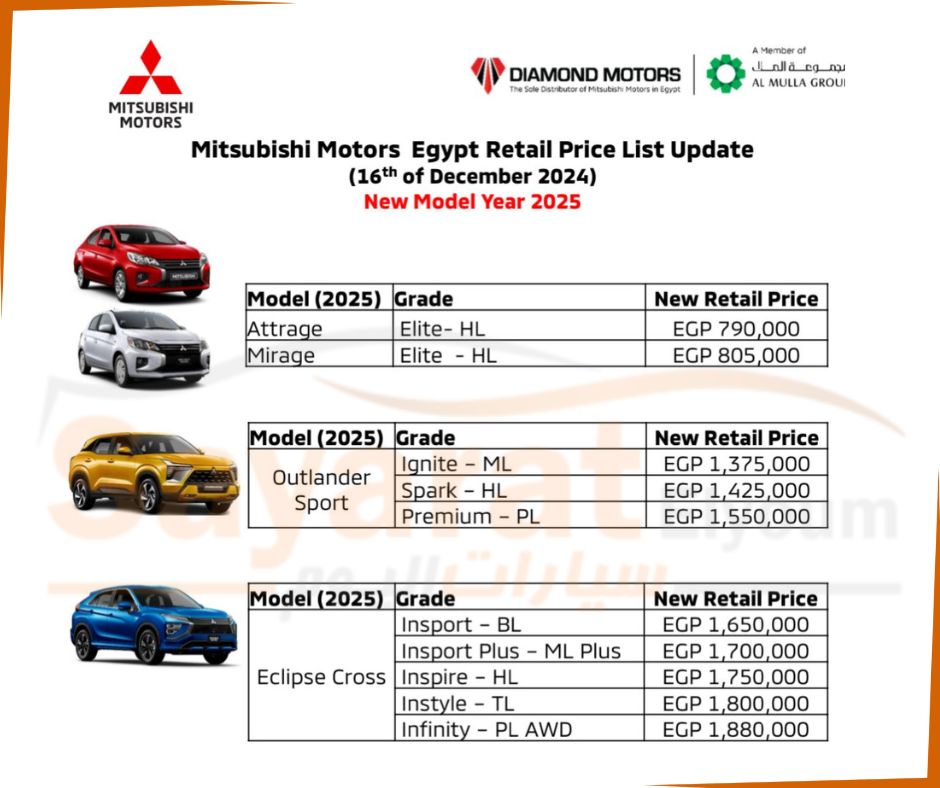في قوائم الأسعار الأخيرة التي أعلنتها شركة دايموند موتورز، تم الكشف عن موديلات ميتسوبيشي لعام 2025. ومع ذلك، لوحظ اختفاء سيارة ميتسوبيشي إكسباندر من هذه القوائم، مما يشير إلى أن العرض الحالي قد يكون فرصة أخيرة للراغبين في امتلاك هذه السيارة المميزة ضمن موديلات 2024.