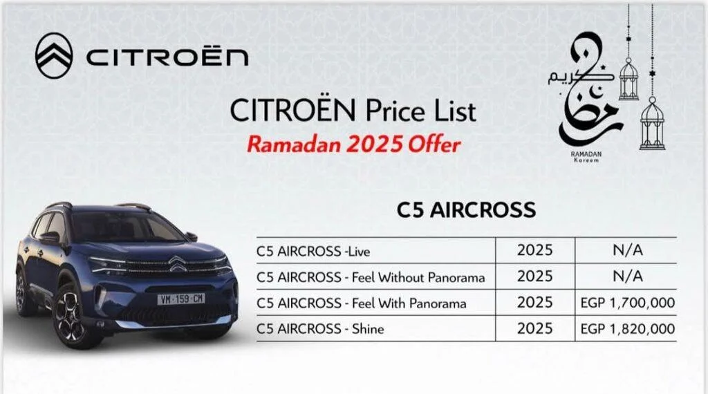 ضمن أكبر التخفيضات الرمضانية، تقدم شركة القصراوي جروب عرضًا مميزًا على السيارة الفرنسية سيتروين C5 آير كروس، المعروفة بتصميمها العصري وأدائها القوي.