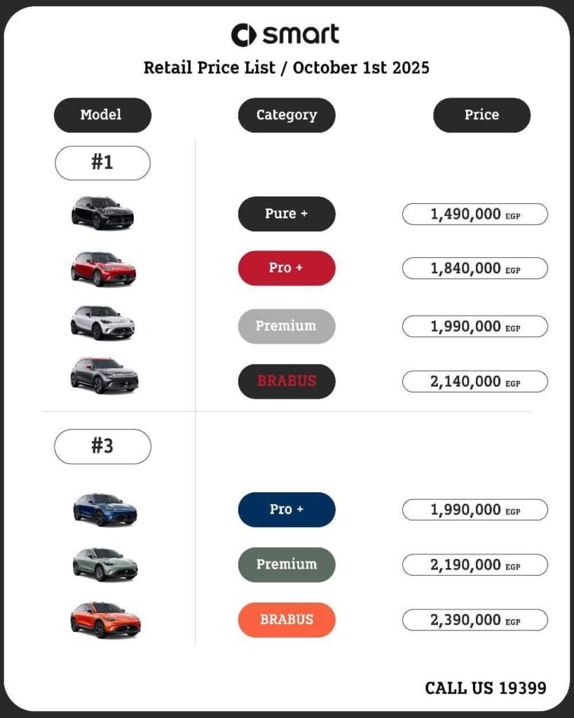 أعلنت مجموعة عز العرب عن تخفيضات كبيرة على أسعار سيارات سمارت الكهربائية، شملت جميع الفئات من الطرازين Smart #1 وSmart #3. وجاءت الأسعار الجديدة على النحو التالي:
