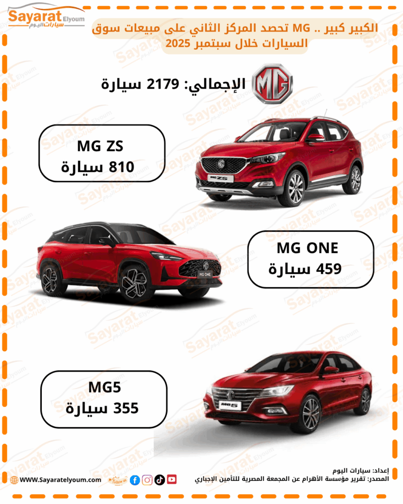 وفقًا لتقرير مؤسسة الأهرام والمجمعة المصرية للتأمين الإجباري، سجلت MG خلال شهر سبتمبر 2025 عددًا إجماليًا قدره 2,179 سيارة ملاكي تم ترخيصها، لتحتل بذلك المركز الثاني في قائمة العلامات التجارية الأعلى ترخيصًا، متفوقة على علامات كبرى مثل هيونداي وشيري وكيا.