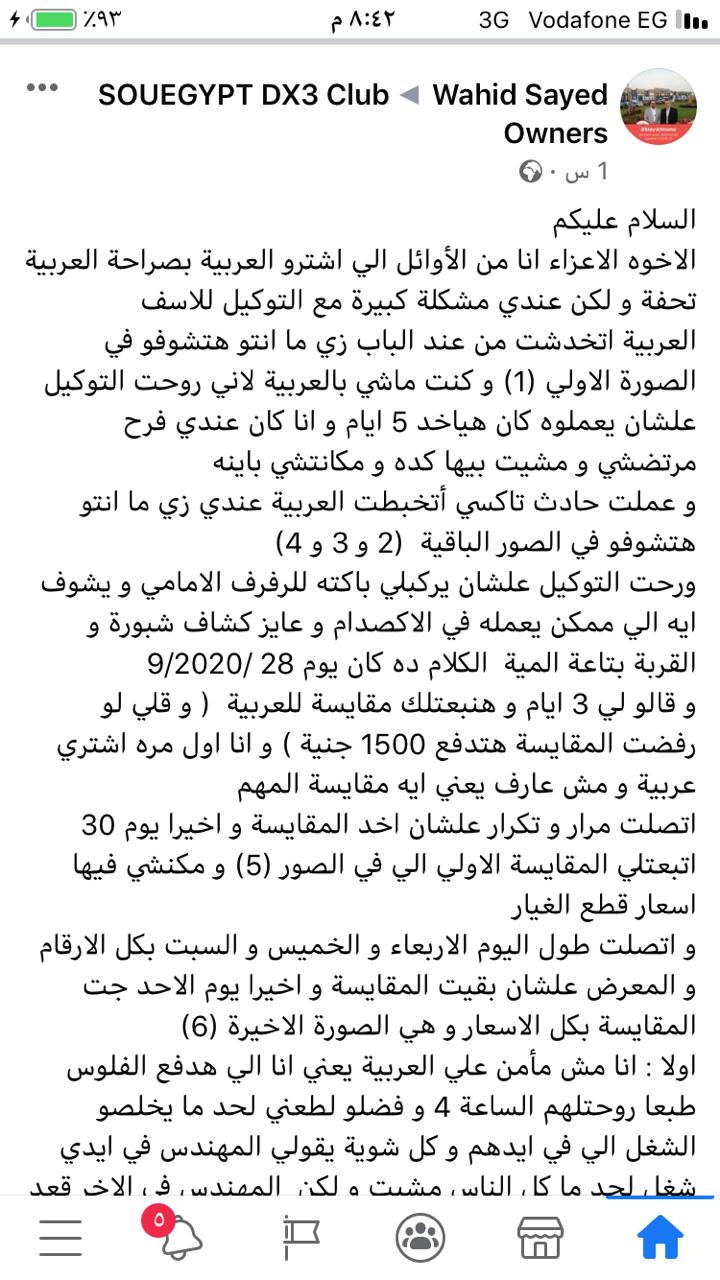 واستكمل في شكواه، أنه اتصل مرارا وتكرارا بالتوكيل لإجراء المقايسة وبعد أيام تم إرسال له المقايسة الأولى والتي لا تحتوي على أسعار قطع الغيار.