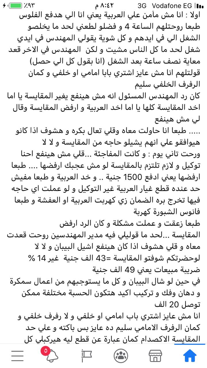 واستكمل: “قولتلهم أنا مش عايز اشتري باب أمامي أو خلفي وكمان الرفرف الخلفي سليم، وكان رد المهندس المسئول أنه مش هينفع يغير المقايسة يا أما أخد المقايسة كلها يا أما أخد العربية وأرفض المقايسة وقال لي مش هينفع، وبعد محاولاتي رحت تاني يوم و كانت المفاجئةن قلي مش هينفع إحنا توكيل ولازم تلتزم بالمقايسة لو مش عجبك ارفضها، و طبعا ارفضها يعني ادفع 1500 جنيه.