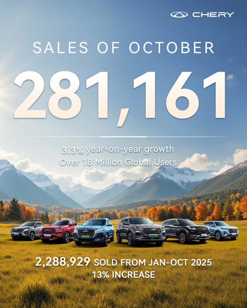 سجلت مجموعة شيري مبيعات بلغت 281,161 سيارة خلال شهر أكتوبر، محققة نموًا سنويًا بنسبة 3.3%. ويأتي هذا الأداء القوي مدفوعًا بزيادة ملحوظة في مبيعات سيارات الطاقة الجديدة (NEVs)، التي بلغت 110,346 وحدة، بارتفاع 54.7% مقارنة بالفترة نفسها من العام الماضي. وتُعد هذه المرة الأولى التي تتجاوز فيها مبيعات شيري الشهرية من هذه الفئة حاجز 110 آلاف سيارة.