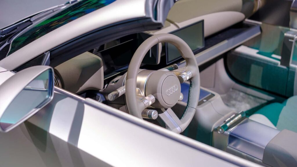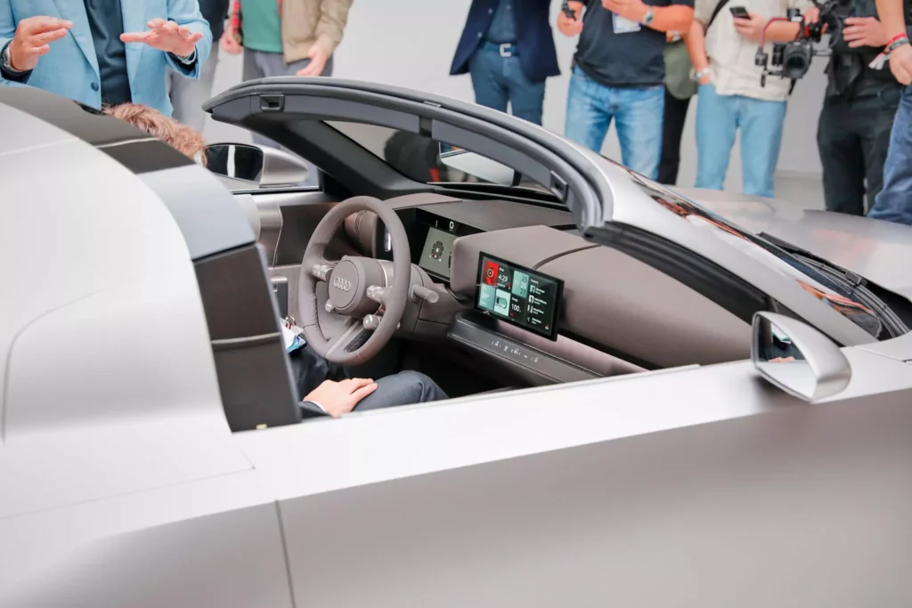 تتميز سيارة أودي المفاهيمية بمقصورة داخلية بسيطة تضم شاشة معلومات وترفيه قابلة للسحب بقياس 10.4 بوصة تختفي عند عدم استخدامها.