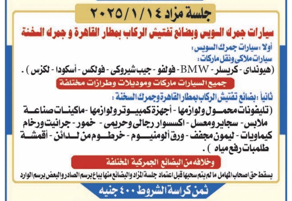 للتقديم والمشاركة في مزاد سيارات جمرك السويس الذي سيُعقد يوم 14 يناير 2025، يجب الالتزام بالشروط التالية:
