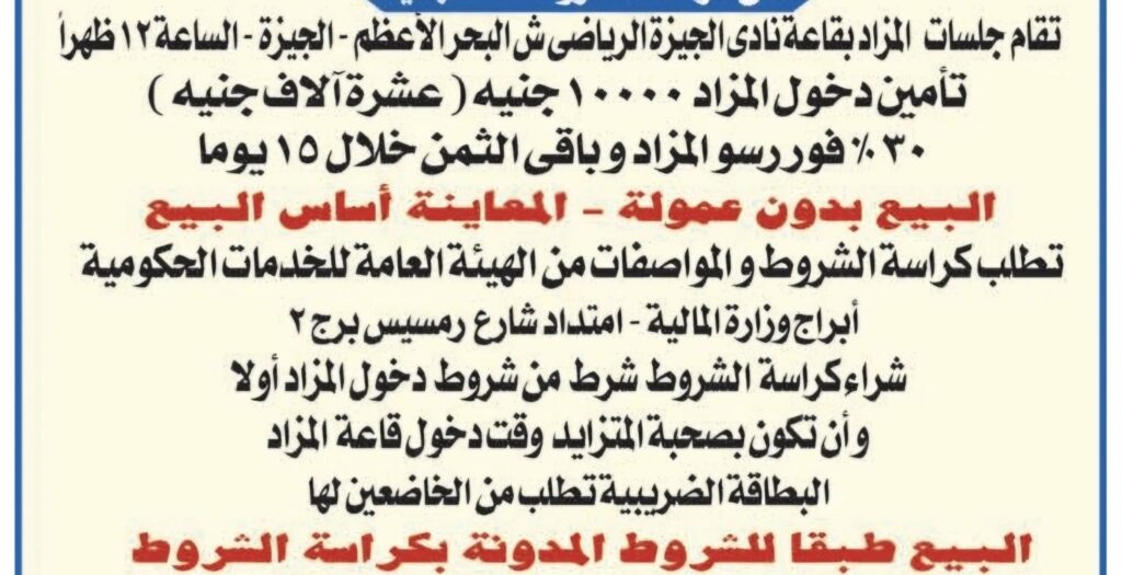 وأوضحت الإدارة في الاعلان الرسمي لها أن جلسة المزاد ستقام بنادي الجيزة الرياضي شارع البحر الأعظم أسفل كوبرى عباس بالجيزة، وتبدأ الجلسة في تمام الساعة ١٢ ظهرًا.