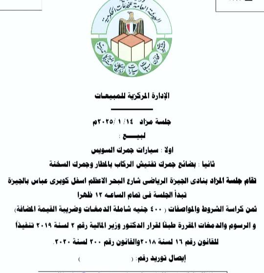 مزاد سيارات جمرك السويس 2025.. أعلنت الإدارة المركزية للمبيعات في الهيئة العامة للخدمات الحكومية التابعة لوزارة المالية، عن بيع سيارات جمرك السويس في مزاد علني يوم الثلاثاء المقبل الموافق 14 يناير 2025.