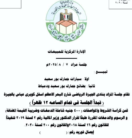 يوم الاثنين الموافق ٧ أغسطس ٢٠٢٥. - مكان مزاد سيارات جمرك بورسعيد: